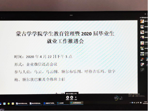 4月22日下午,公司在线上召开员工教育管理暨2020届毕业生就业工作推进会议。公司党总支书记乌云、副书记乌云图、团学办主任额尔布乐图、副主任呼格吉乐玛及辅导员、班主任参加会议。乌云图副书记主持会议。