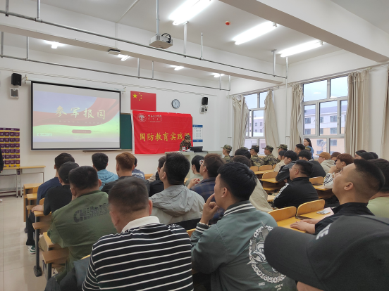 员工工作处国防教育实践团刘莉以“参军报国”奋进新时代,领航新征程为主题,从征兵入伍条件及要求、入伍的优惠政策、入伍的基本流程、国防的意义等四个方面进行了详细介绍。宣讲过程中播放了视频“我们为什么去当兵”。